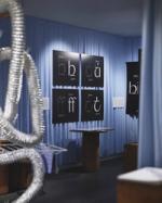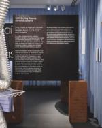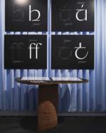 Hemp shiv panels and rammed earth plinths with a fabric backdrop.